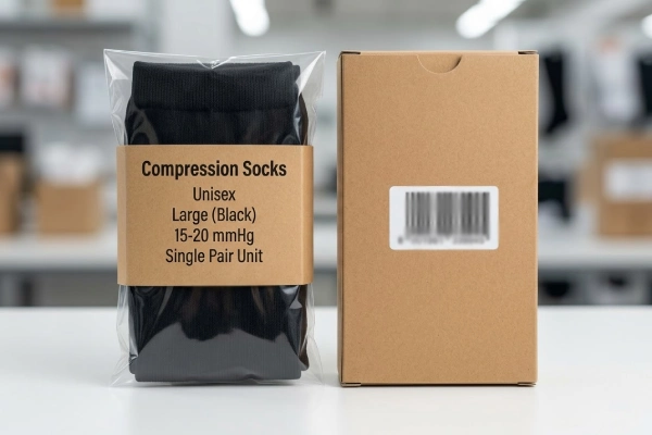 Multi-pack compression socks act as a single retail unit. The outer package needs one barcode matching the bundle, and you should apply clear set wording like “Sold as Set” so warehouse workers do not separate the socks.