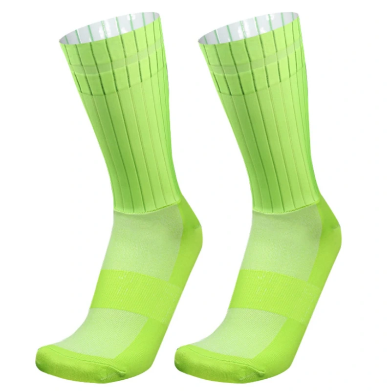We use premium materials to ensure both performance and comfort. The sock body is typically a high-elastic nylon and Lycra (spandex) blend. We can accommodate material upgrades too. For instance, some clients request CoolMax® yarn (a performance polyester) in the foot area for even faster moisture evaporation, or merino wool blends for cooler weather cycling – we are flexible in adjusting the knitting to your needs.