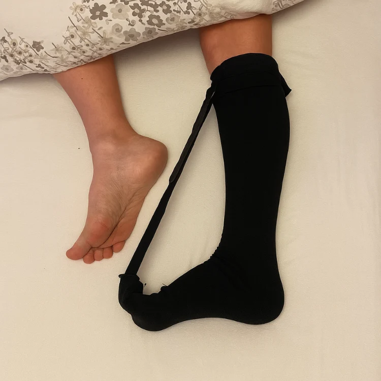 A plantar fasciitis night sock is a soft dorsal splint you wear while sleeping. It keeps your foot gently flexed so the plantar fascia and Achilles tendon stay lightly stretched instead of tightening overnight. This helps reduce morning heel pain and stiffness. Compared with rigid night splints, a sock design is lighter, cooler and usually more comfortable for long-term use.