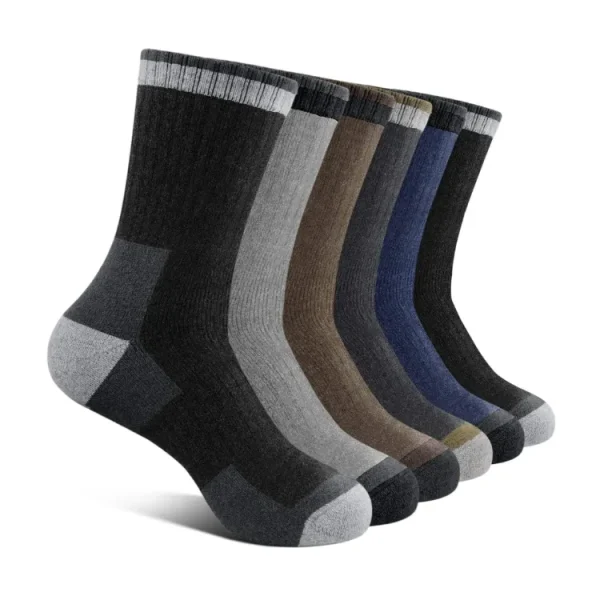 Outdoor / Field Work (steel-toe boots) — Climate-tuned builds for capped footwear: fast-dry, breathable blends manage heat and humidity beneath the cap; thermal Merino/acrylic terry insulates in cold regions without adding bulk at the toe seam.